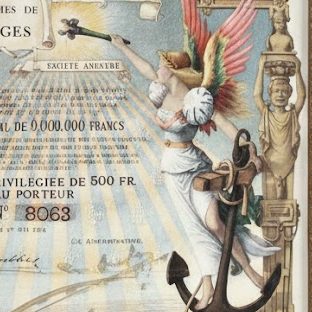 The certificate's artistic style is a fusion of topographical and allegorical themes, a common practice for European securities of that era.