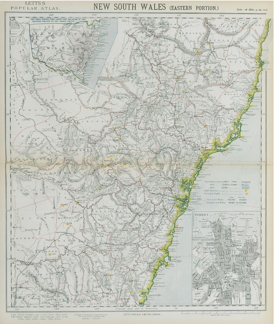 1883 Gold Rush - New Gold Mountain Map. NEW SOUTH WALES showing gold mining stations. Sydney city plan. LETTS 1883 map