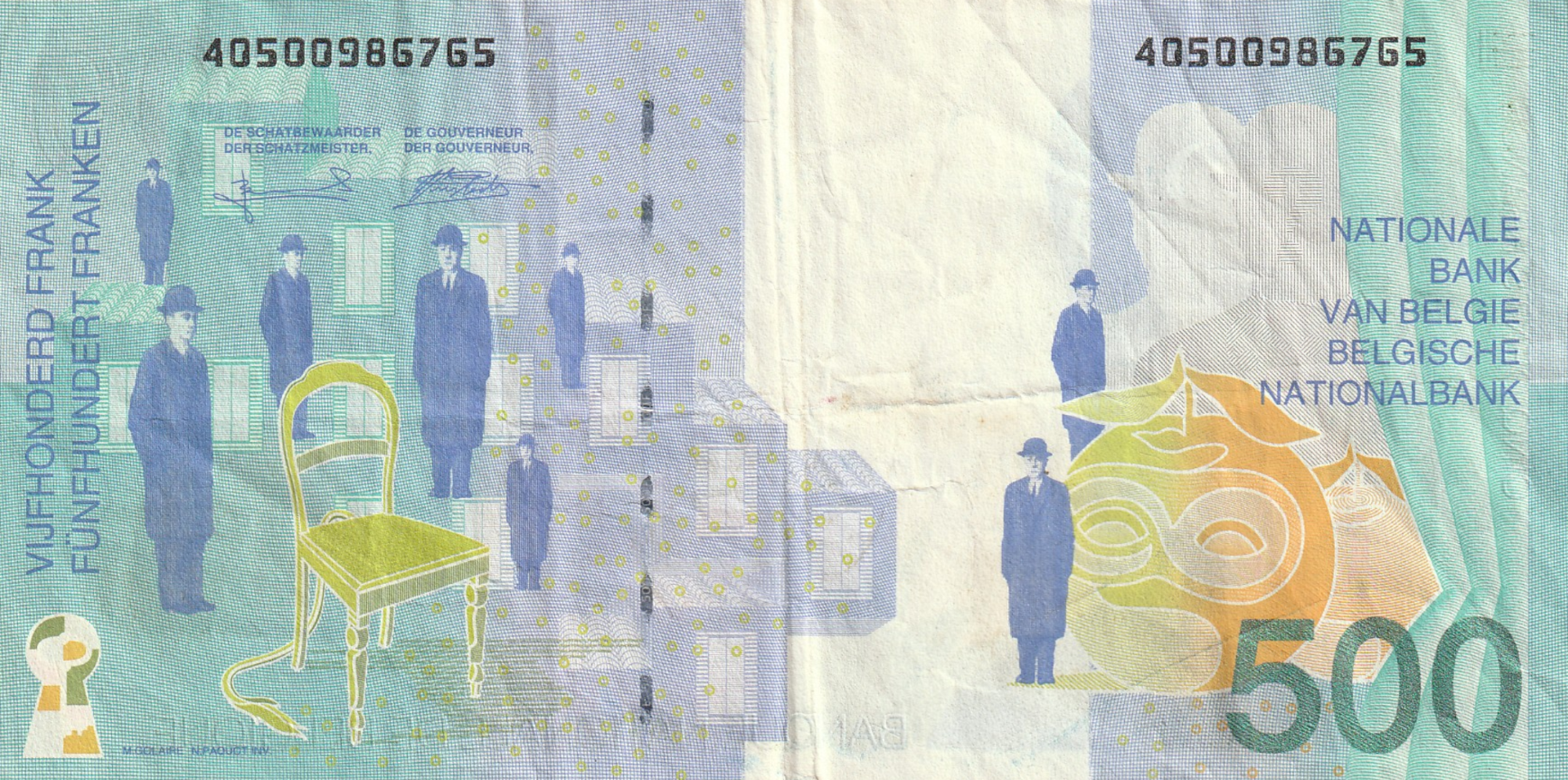 This note is a Surrealist-style design, Inspired by René Francois Ghislain Magritte’s master piece, The “Golconde”