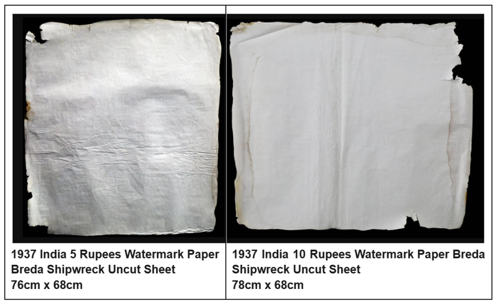 After 52 years, in 1992, the Tralee Bay Diving and Watersports Club discovered that in one of the long-hidden cargo holds, the remains of paper were found inside wooden boxes; those wooden boxes had been eaten away, and the edges of the uncut sheets were a little ragged, but this treasure was still intact! The banknote paper is an authentic relic from that shipwreck. It was originally intended to become a five-rupee and ten-rupee banknote from India. The watermark features a likeness of King George VI, along with the denomination and the words "RESERVE BANK OF INDIA." So, how can they survive at the bottom of the sea for more than 50 years?