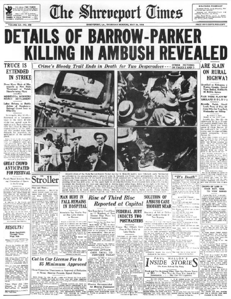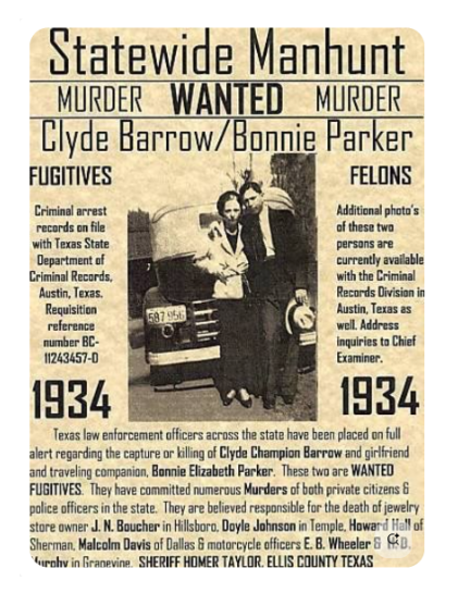 Bonnie Elizabeth Parker (October 1, 1910 – May 23, 1934) and Clyde Chestnut "Champion" Barrow (March 24, 1909 – May 23, 1934) were American outlaws who traveled the Central United States with their gang during the Great Depression, committing a series of criminal acts such as bank robberies, kidnappings, and murders between 1932 and 1934. The couple was known for their bank robberies and multiple murders, although they preferred to rob small stores or rural gas stations. Their exploits captured the attention of the American press and its readership during what is occasionally referred to as the "public enemy era" between 1931 and 1934. On May 23, 1934, they were ambushed and killed on Louisiana Highway 154 in Bienville Parish, Louisiana, by a law enforcement posse led by retired Texas Ranger Frank Hamer. They are believed to have murdered at least nine police officers and three civilians.